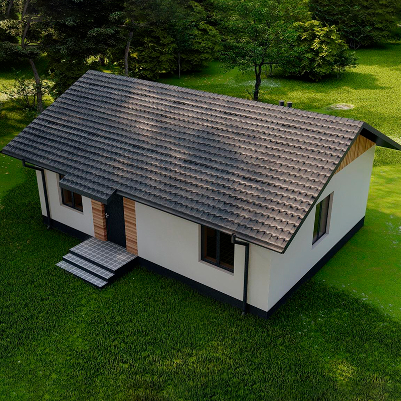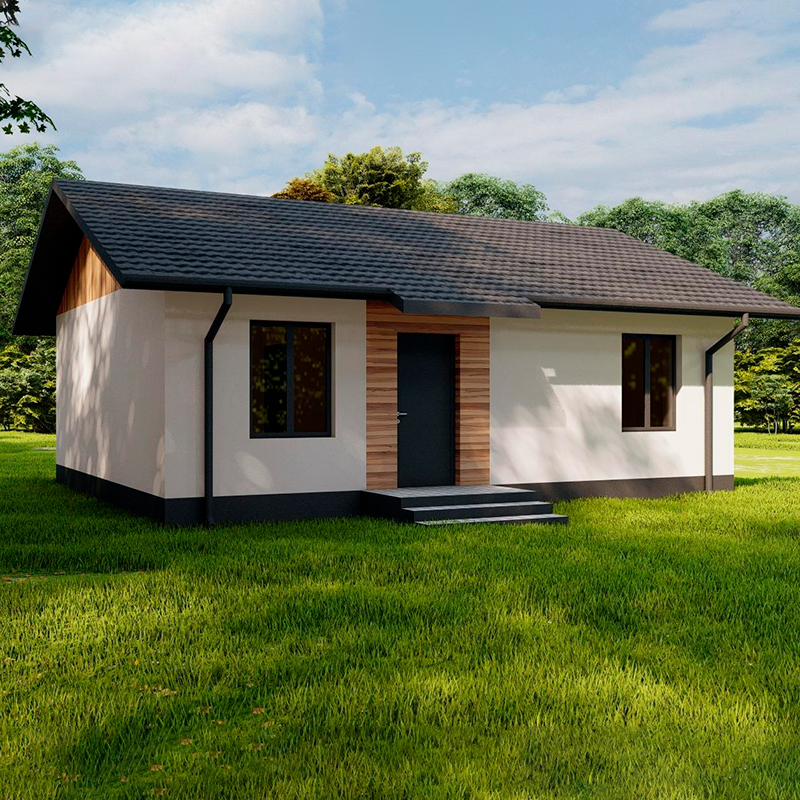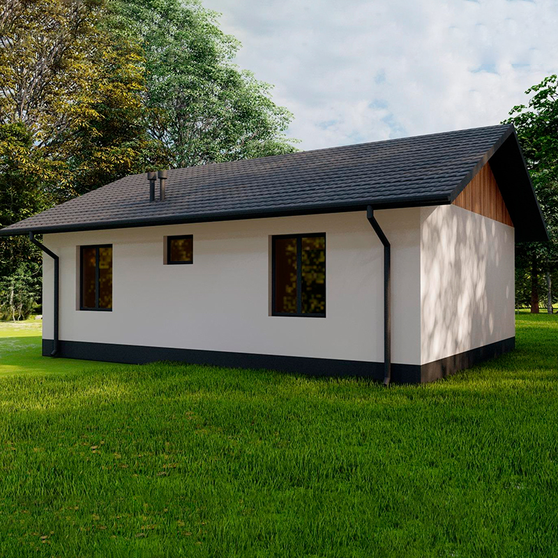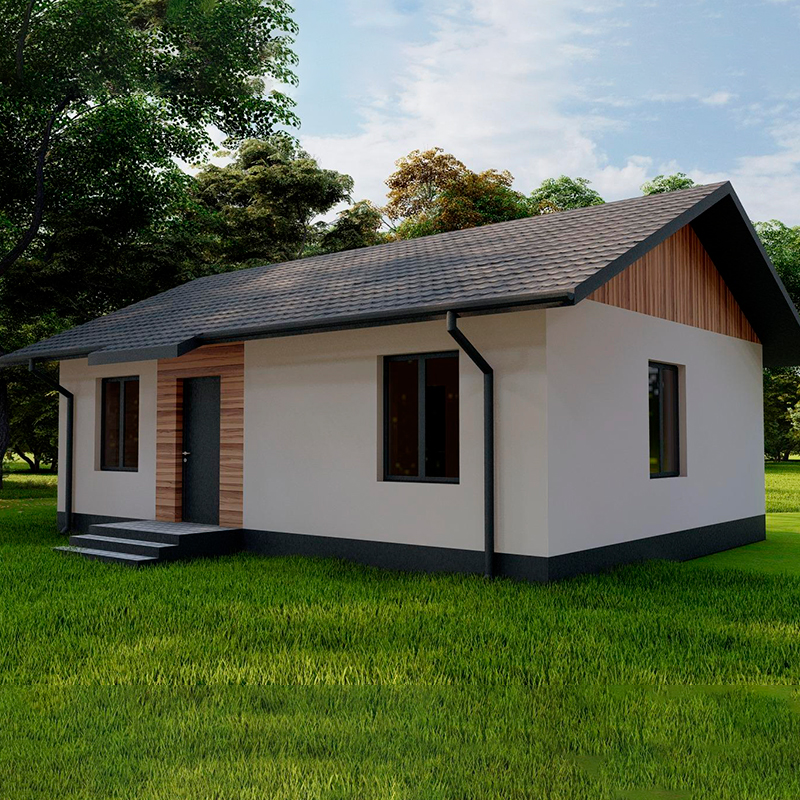 Заказчик поставил цель спроектировать дом до 50 м2, но с двумя спальными комнатами и полноценной кухней-гостиной. В результате получился очень симпатичный дом для постоянного проживания.