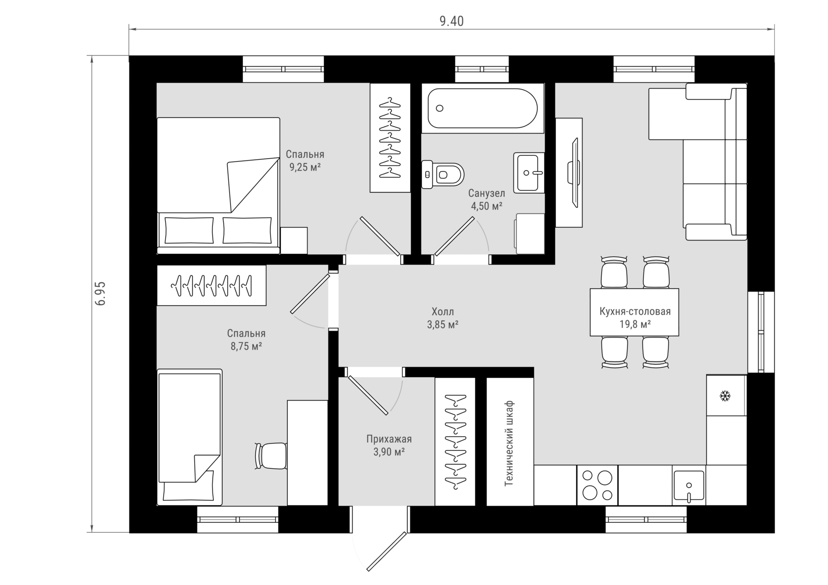 Площадь дома 50 м2, но он имеет две спальные комнаты 9,25 м2 и 8,75 м2. Просторную кухню-столовую (кухня-гостиная) 18,42 м2. В ней же спланирована ниша для газового котла. Санузел 4,50 м2 и отделенный тамбур 3,90 м2.