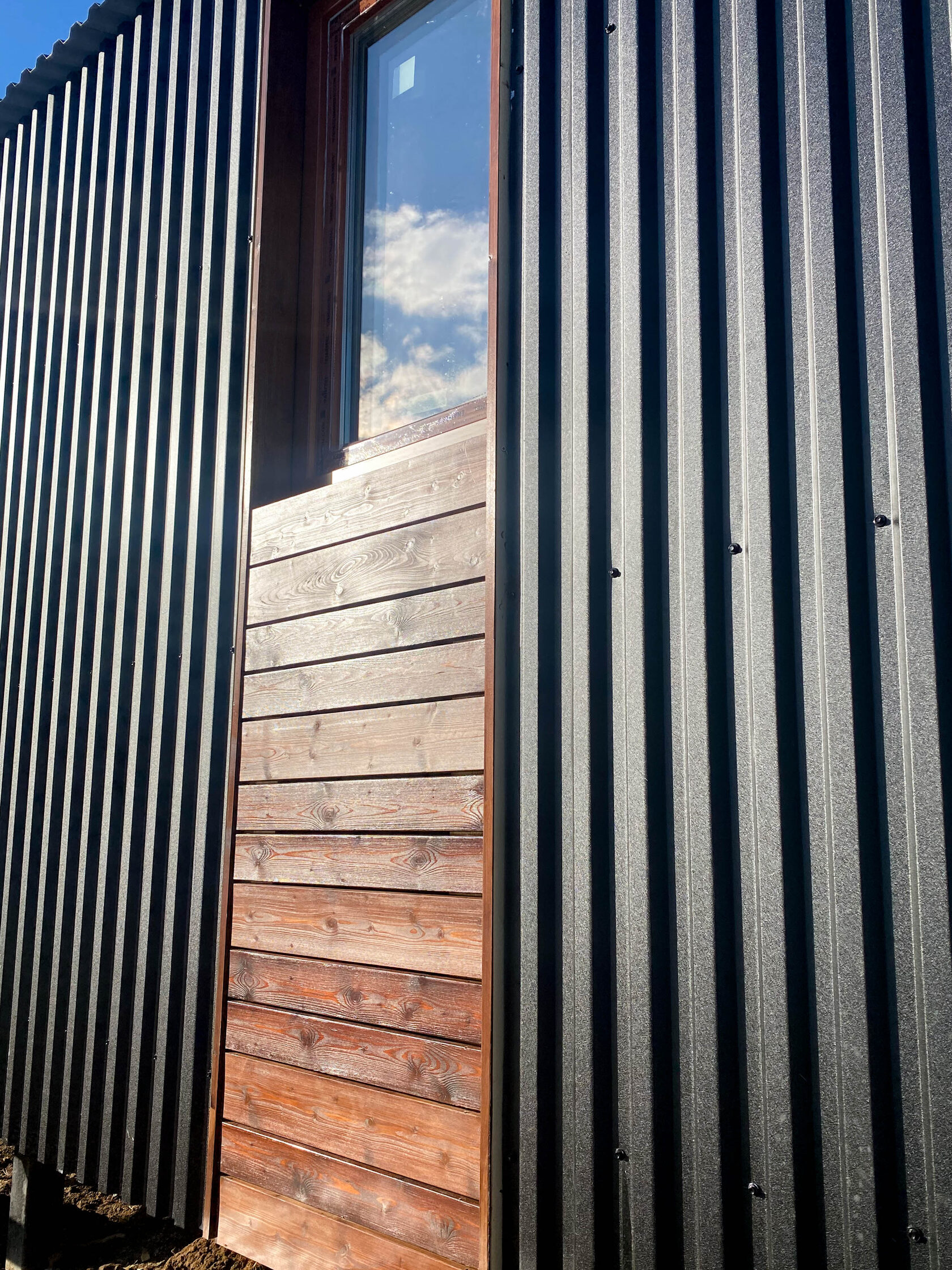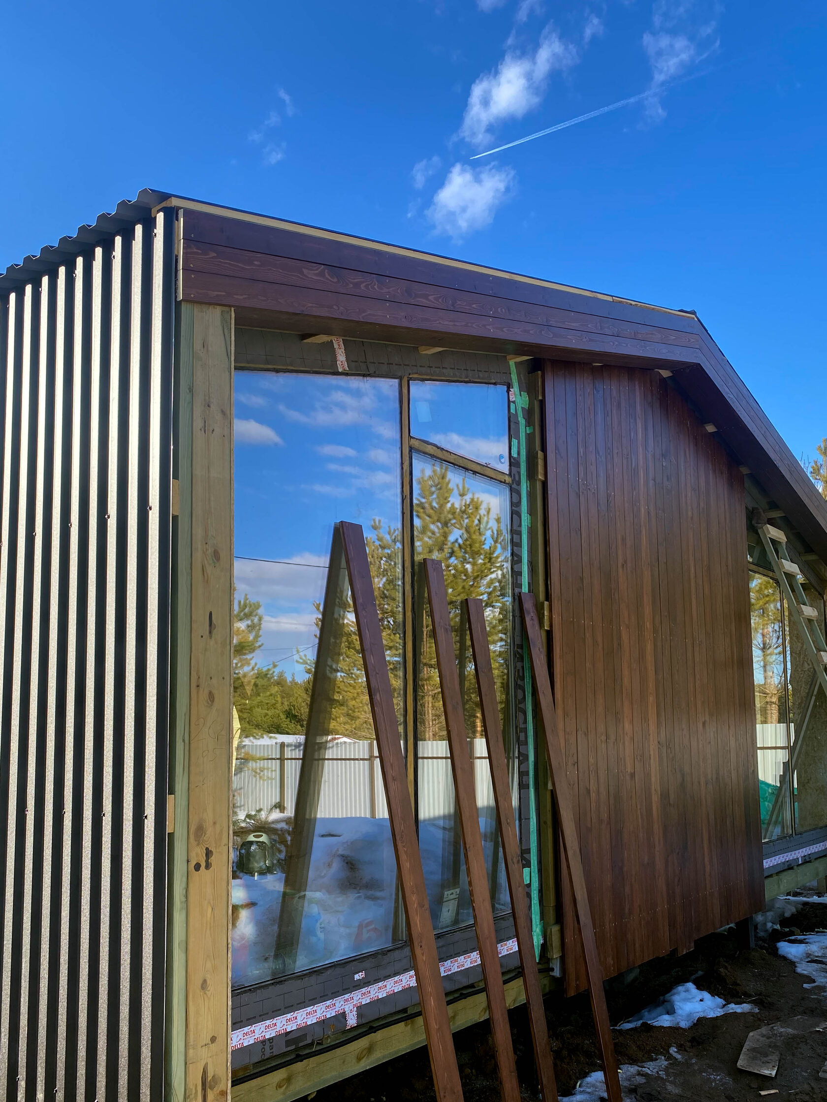 Когда “коробка” завершена, мы начинаем работы по внешней отделке: монтируем профлист, планкен и декоративные элементы. Отметим, что все деревянные составляющие приходят на объект заранее, отшлифованные и окрашенные на нашем производстве.
